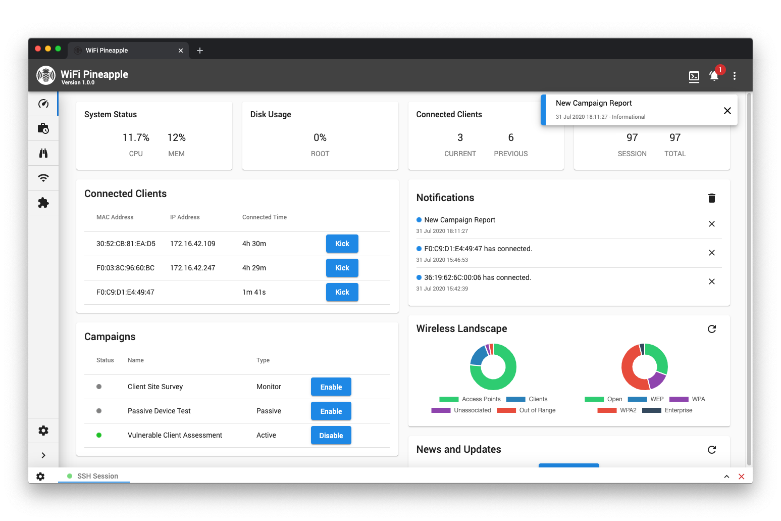 En rafine WiFi Pineapple’ı deneyimleyin. Sezgisel arayüzler sizi WiFi denetiminde yönlendirir. Kampanyalar, çarpıcı raporlarla penetrasyon testlerini otomatikleştirir. Etkileşimli keşif sizi hava sahasının komutasına koyar ve adanmış radyoların tamamlayıcısı kurumsal düzeyde sonuçlar sağlar.